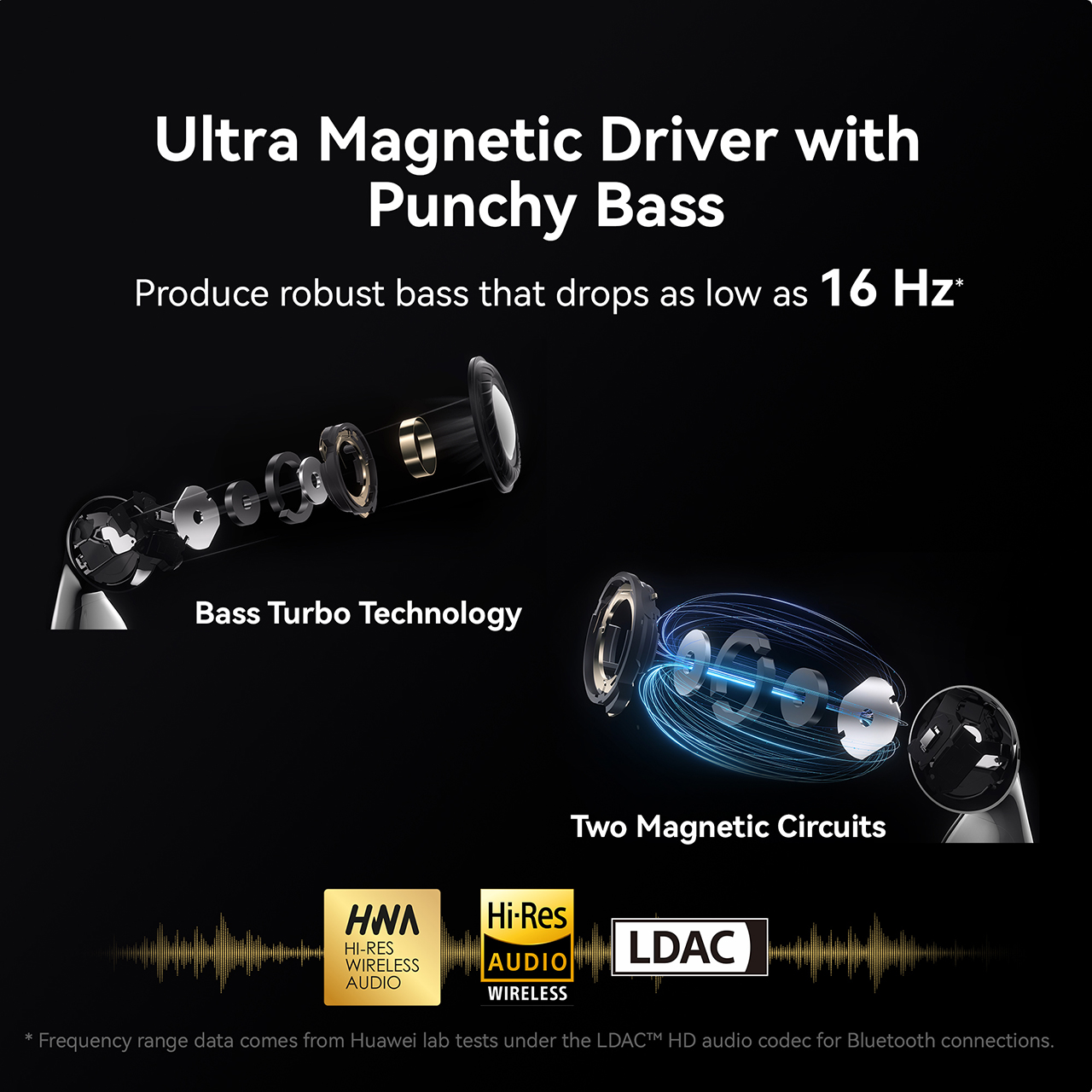 - Frequency range data comes from Huawei lab tests under the LDAC™ HD audio codec for Bluetooth connections.