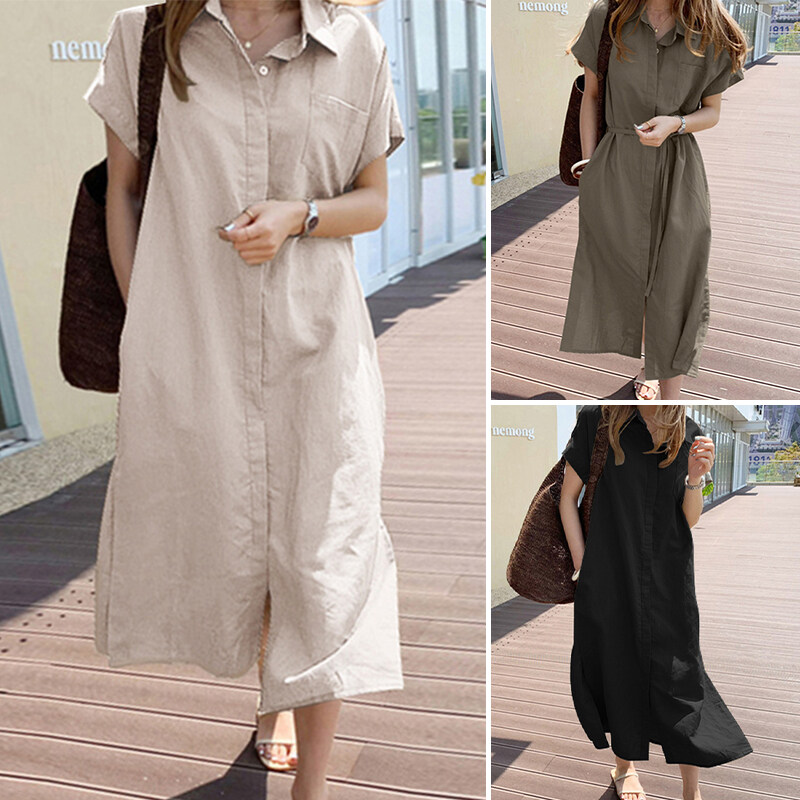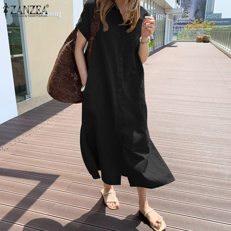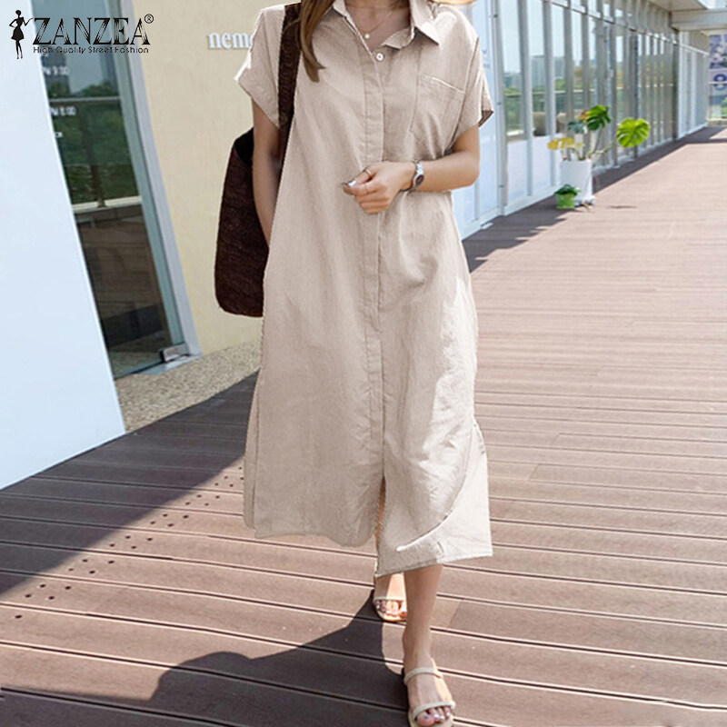 ZANZEA Korean Style Women Short Sleeve Lapel Button Down Shirt Dress Cotton Plain Midi Sundress