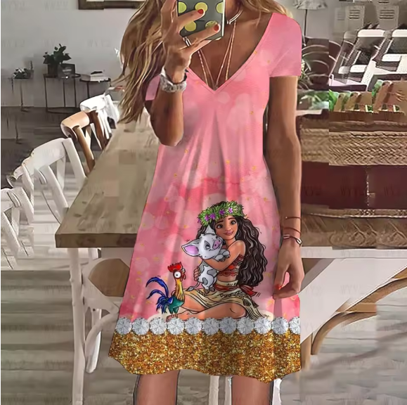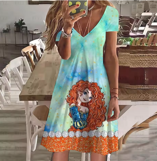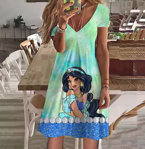 2023 New Disney Princess Casual Pattern Printing Ladies Dress V Neck Short Sleeve Dress Summer Casual Beach Wind Dress