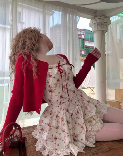 2025 New Sweet Floral Dress Set Woman Casual Red Short Cardigan Elegant Lace Y2k Mini Dress Beach Korean Fashion Clothing Suit