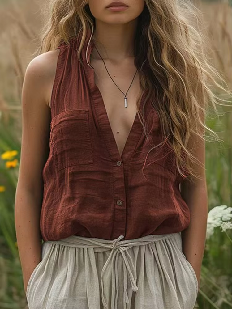 2025 Women New Sring Summer Blouse Casual Loose Fashionable Sleeveless Cotton Linen Solid Color V-neck Pocket Vest Shirt Woman