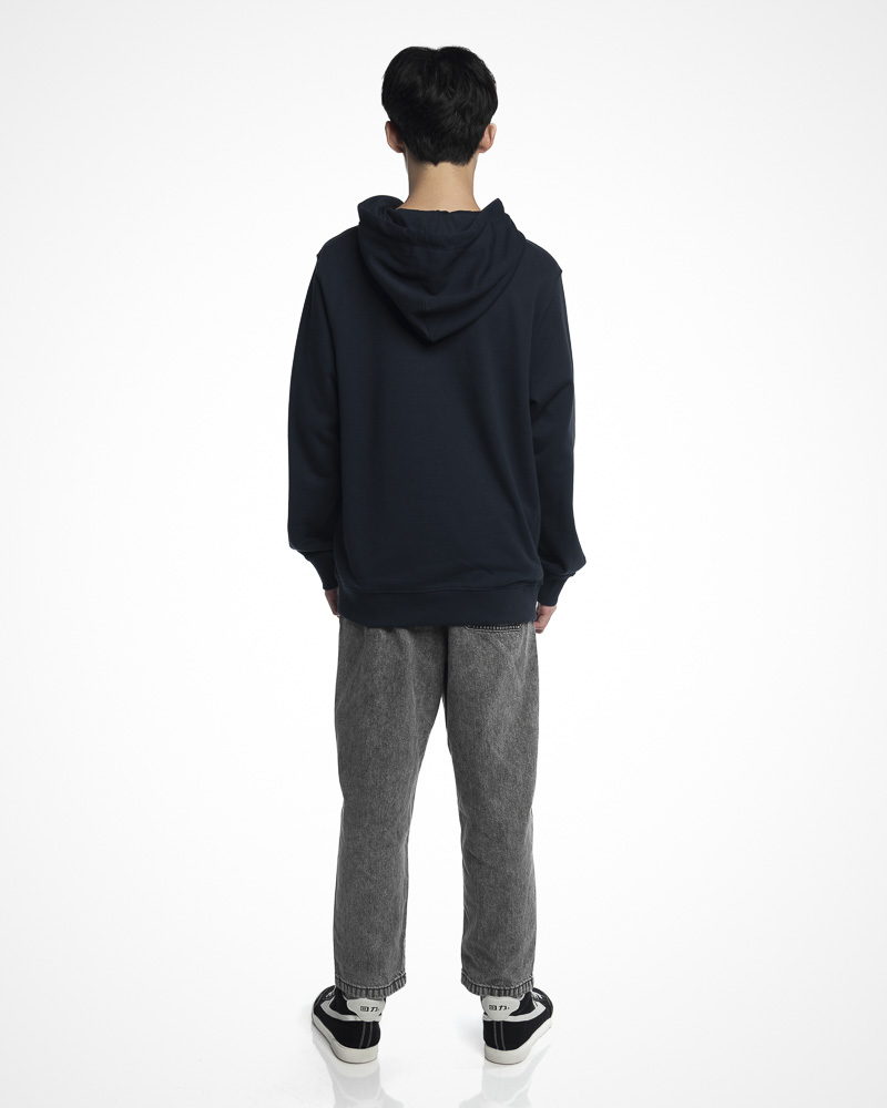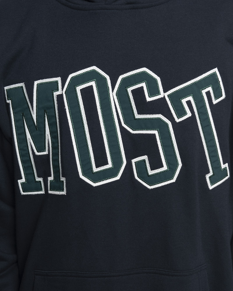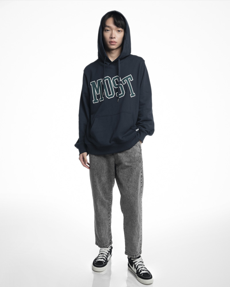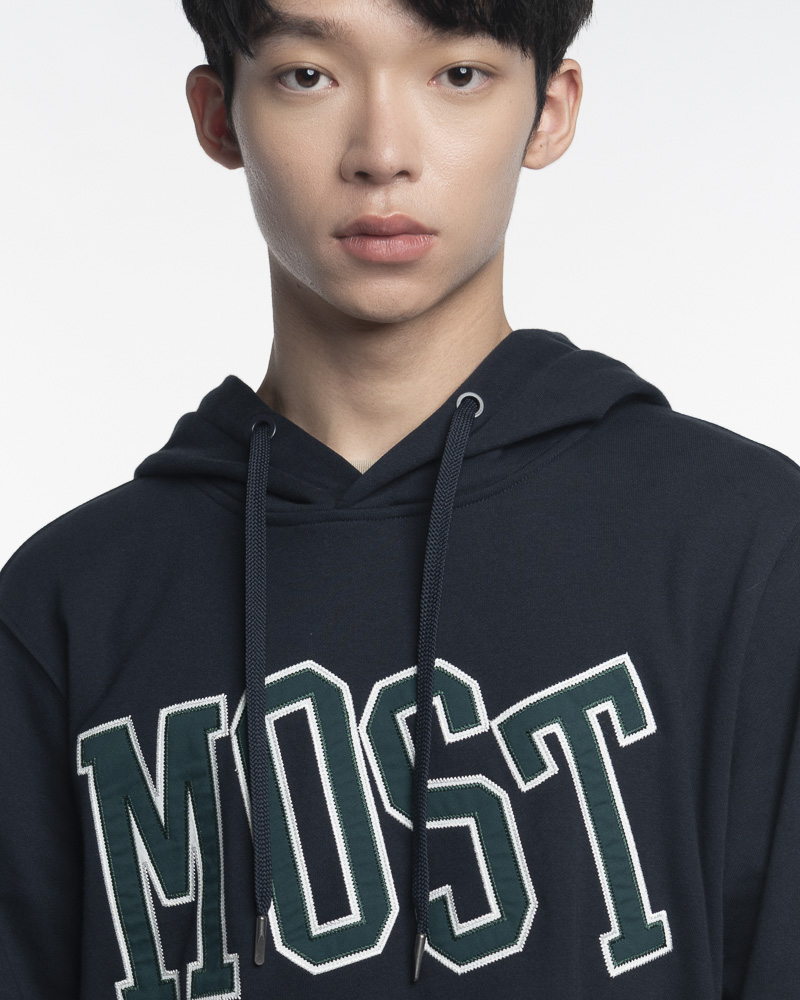 Yishion Men Solid Coloured Pullover Hoodie with Kangaroo Pockets and MOST Slogan Patch (Dk. Blue)