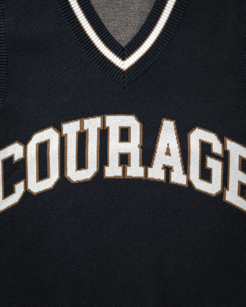 Regular Knitted V Neck Varsity Vest with Contrasting ColourNeckline and Hems. Comes with 'COURAGE' Slogan at the front. Made of cotton. Colours available: Dark Blue