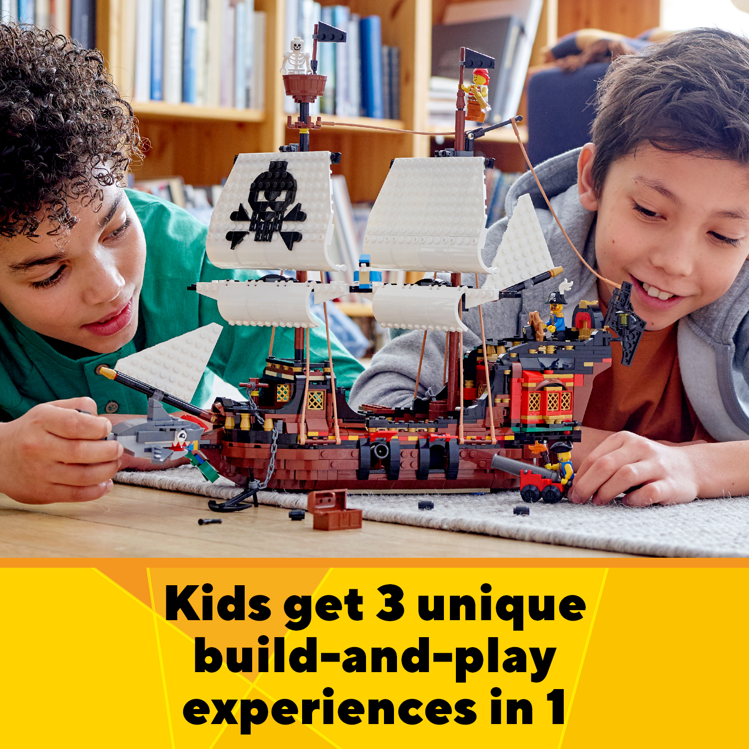 With 1,260 pieces, this LEGO® Creator 3in1 playset is perfect for kids aged 9 and up. The Pirate Ship features movable sails and anchor, plus loads of other details and accessories to spark imagination and open creative play.