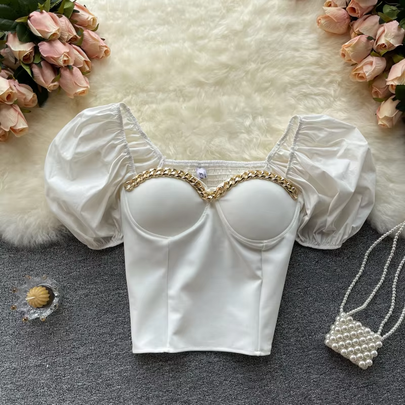 Belly Button Shirt Chic Chain Off Shoulder Expose Clavicle Tank Top Summer Puff Sleeve Crop Tops Women Elegant Sexy Slim Blouses