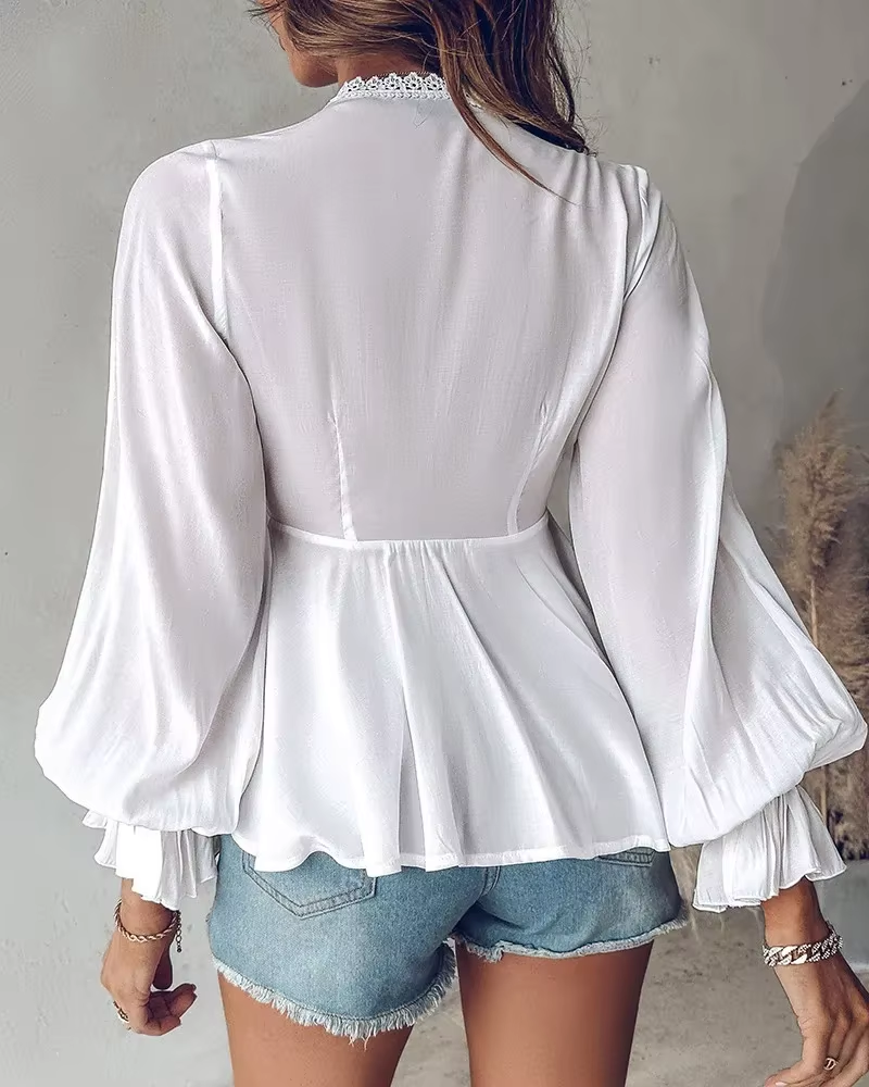 Blouses Women Fashion 2025 Spring Casual Solid Tops Sexy Plunge V-Neck Lace Patch Frill Hem Ruched Lantern Sleeve Top Lady Shirt