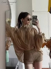 Casual Blouse Women Loose V-neck Satin Shirts Female Lantern Sleeve Lace up Spring Summer Khaki Top Lady All-match Holiday Cozy