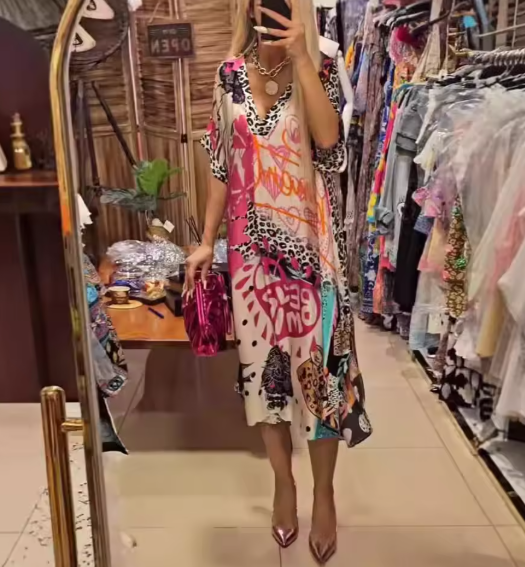 Casual V Neck Loose Midi Dresses For Women Summer Leopard Colorful Printed A-Line Party Dress Short Sleeve Female Clothing