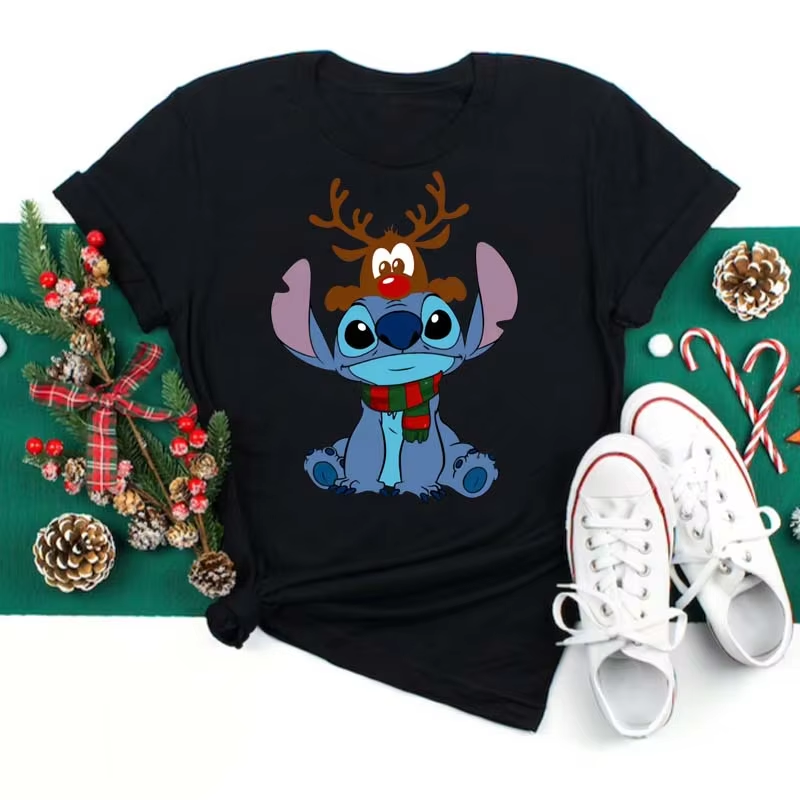 Cute Stitch Printed T Shirt for Women Tops Cartoon Merry Christmas Graphic Tees Red T-shirt Female Tshirt Clothes