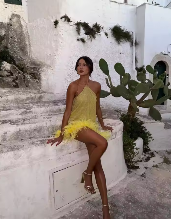 Feather Mini Dresses Sparkly Short Dress Women Sleeveless Naked Waist Dress Summer Party Evening Female Vestidos