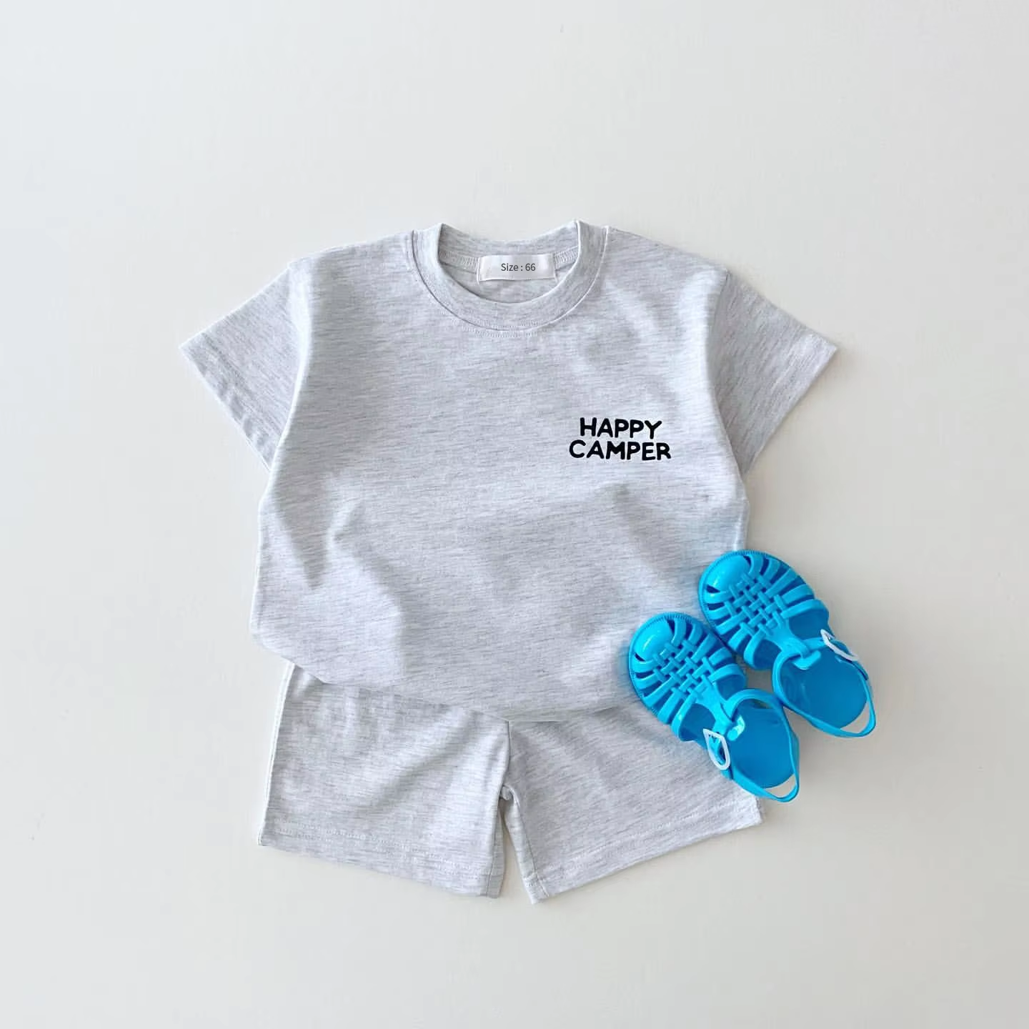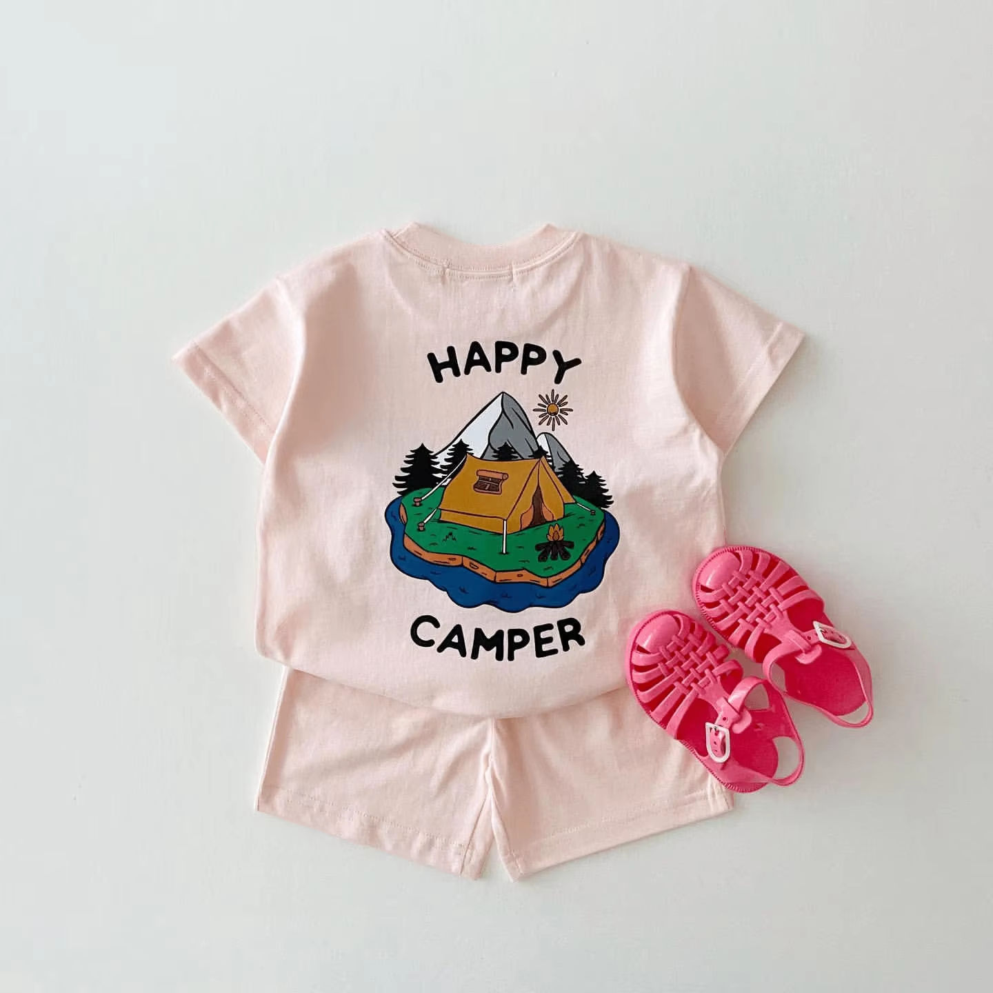 Korean Style Summer Toddler Kids Baby Boy Clothes Sets Two Sided Happy Camper Print T-shirt+Organic Cotton Shorts Girl Clothes