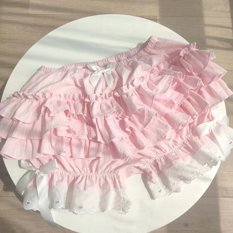 Lolita Short Maid Ruffle Shorts Womens Cute Lace Trim Layered Ruffle Bloomers Short Cotton Bowknot Frilly Security Short Pants