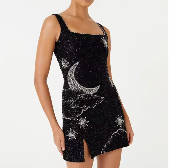 Sequins Embroidery Women Dresses Shining Square Collar Vacation Lady Mini Dress 2025 Sexy Sleeveless Backless Chic A-line Robe