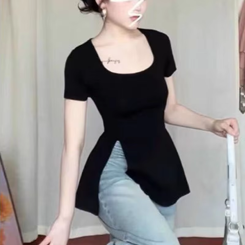 Split Crop Top Women 2025 Summer Solid Y2k T-shirt Korean Style Short Sleeve Tees Tshirts Femme Fashion Clothing Female 2024 New