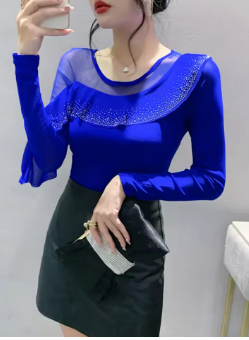Spring Autumn Ringstones Ruffles Long Sleeve Mesh T-shirt Tee New Female Round Collar Sheath Tops T-shirts for women