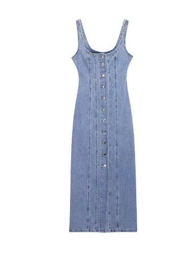 Trendy Women's Button-Down Denim Maxi Dress Washed Blue Spaghetti Strap Bodycon Design For Woman Summer Casual Daily Streetwear