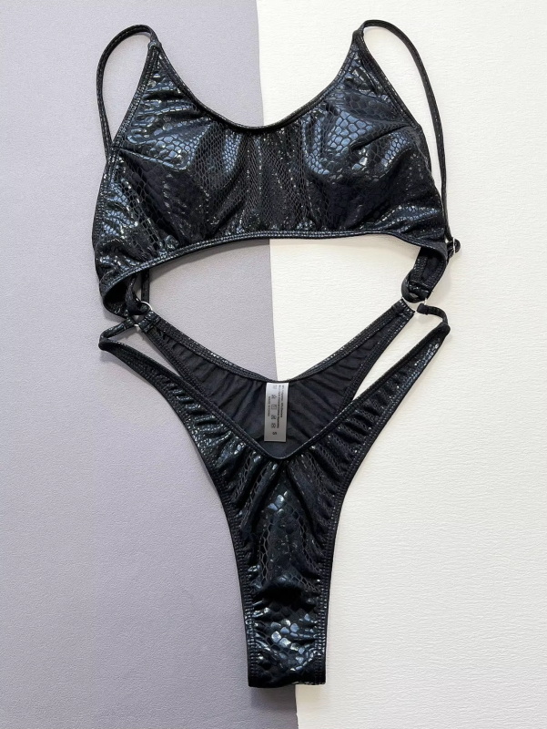 Women black snake print metallic swimsuit one piece hollow backless bikini Swimwear bathing suit beach outfits bodysuit biquini