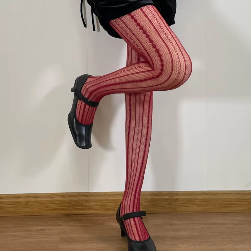 Women Sexy Lace Fishnet Pantyhose Lolita Style Hollow Out Design Red Silk Stockings JK High Waist Striped Tights Christmas Gifts