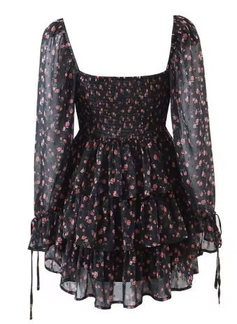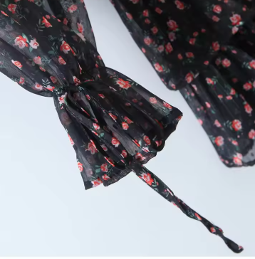 2022 Fashion Women Vintage Floral Print Chiffon Dress Sexy Semi-Sheer Long Sleeve Layered