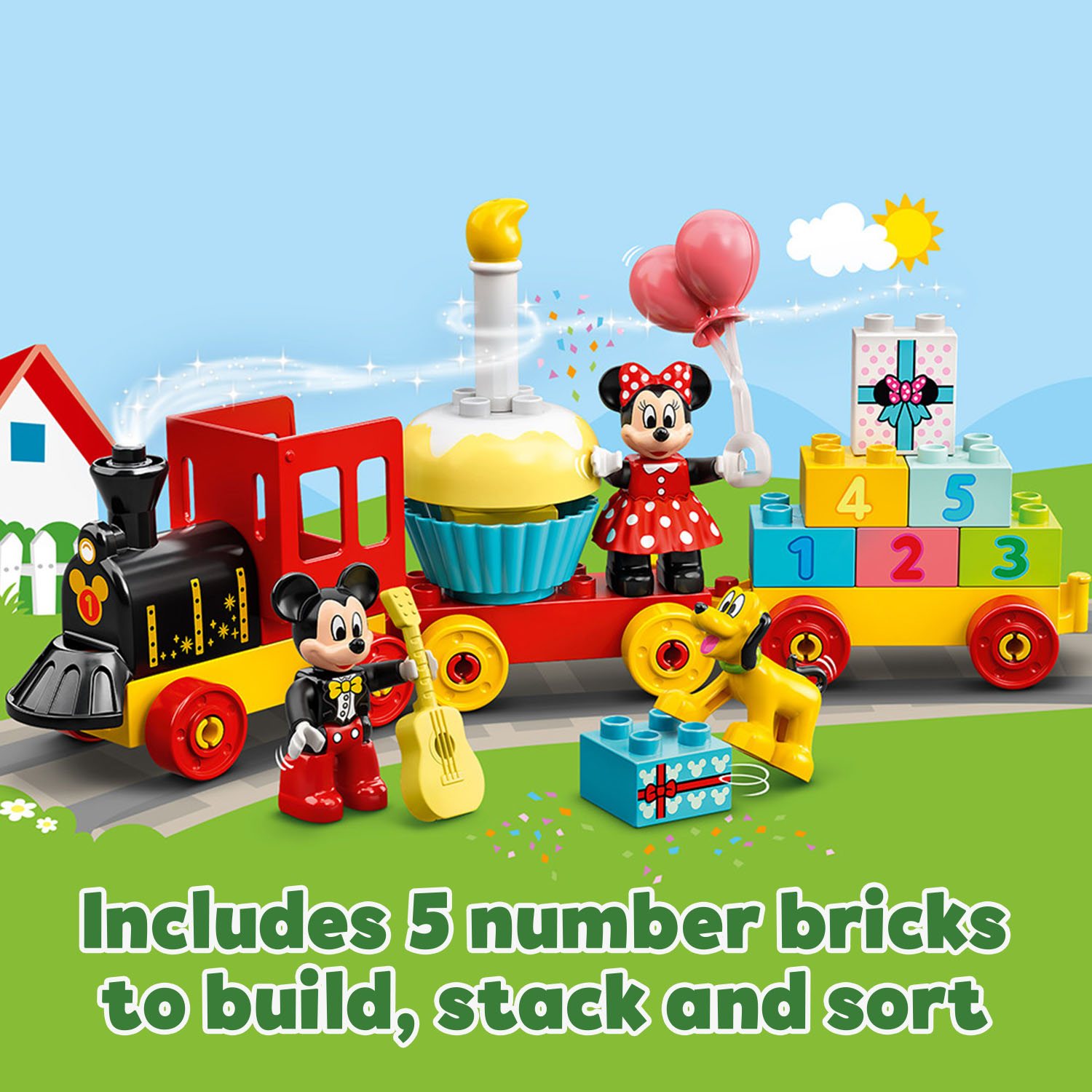 This colourful playset includes 3 Disney figures, a 3-part train, birthday cake, number bricks and accessories.