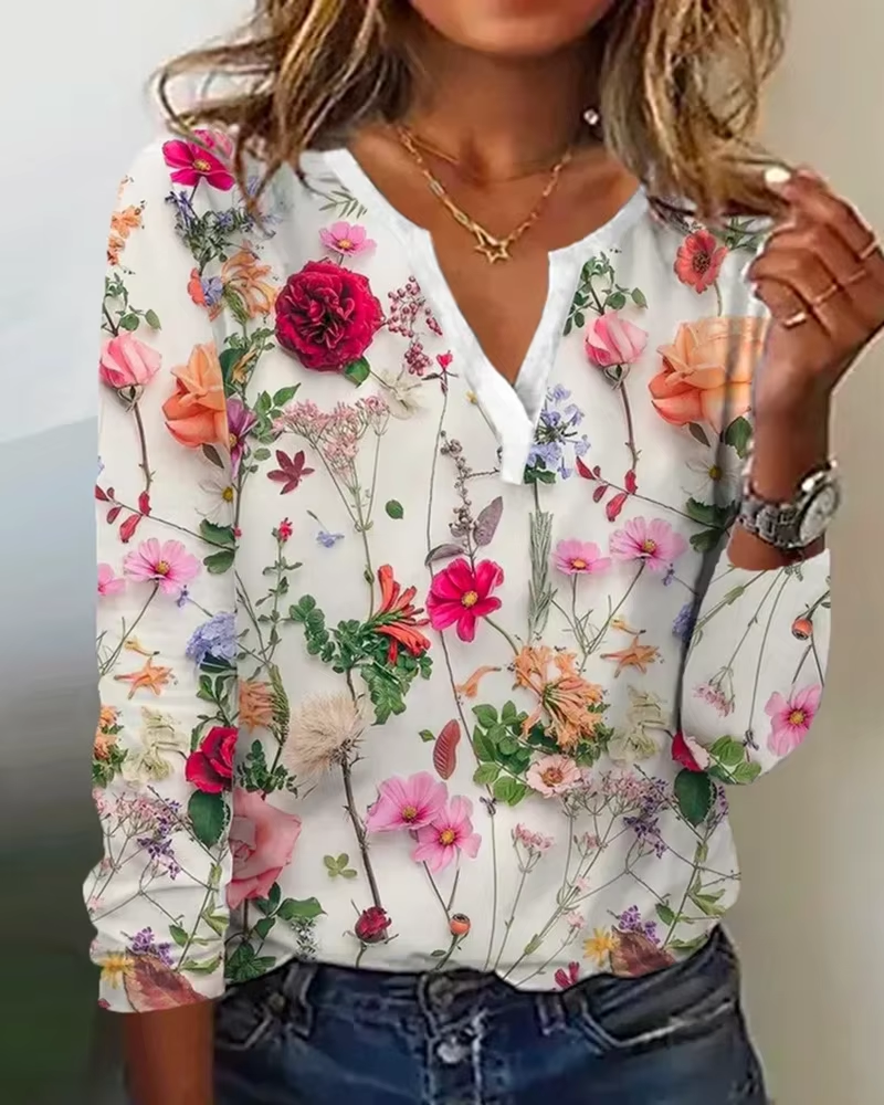 2024 Summer Flower Printed Long Sleeved T-shirt Women Loose Elegant Tops V-neck Office Lady Vacation Beach Casual Sweet Blouse