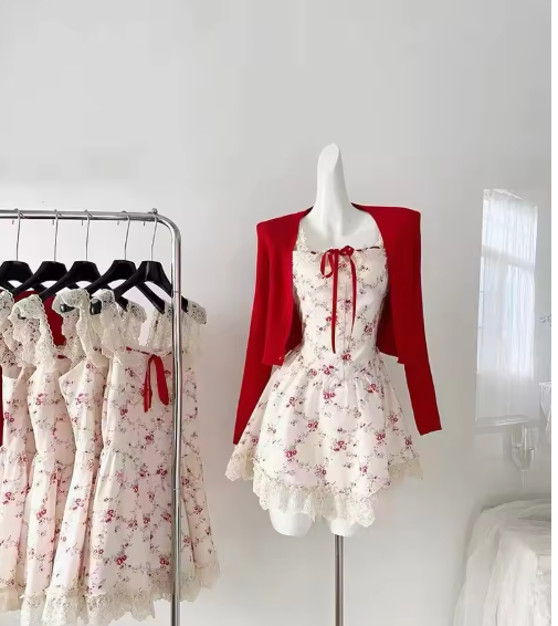 2025 New Sweet Floral Dress Set Woman Casual Red Short Cardigan Elegant Lace Y2k Mini Dress Beach Korean Fashion Clothing Suit