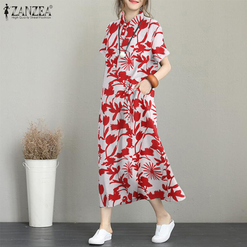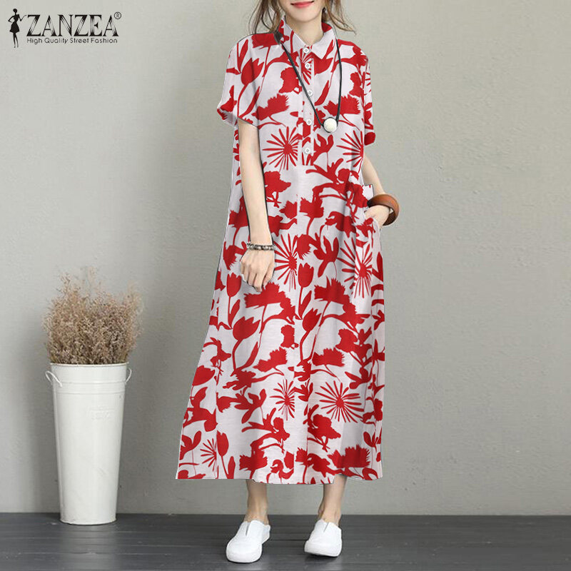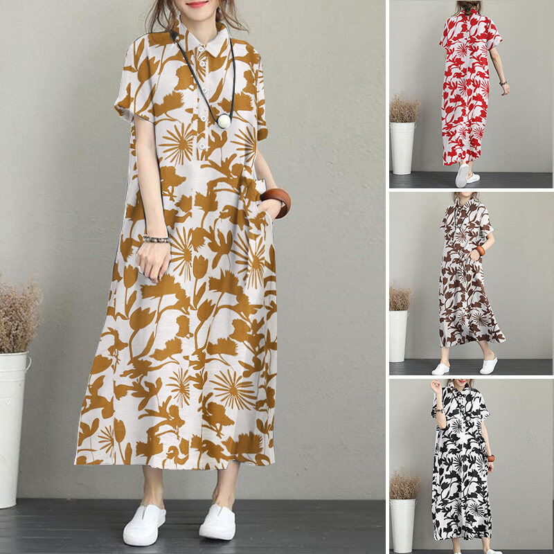ZANZEA Women Summer Short Sleeve Baggy Long Dress Floral Printed Maxi Shirt Dresses