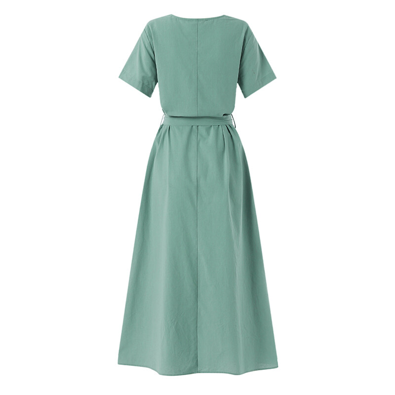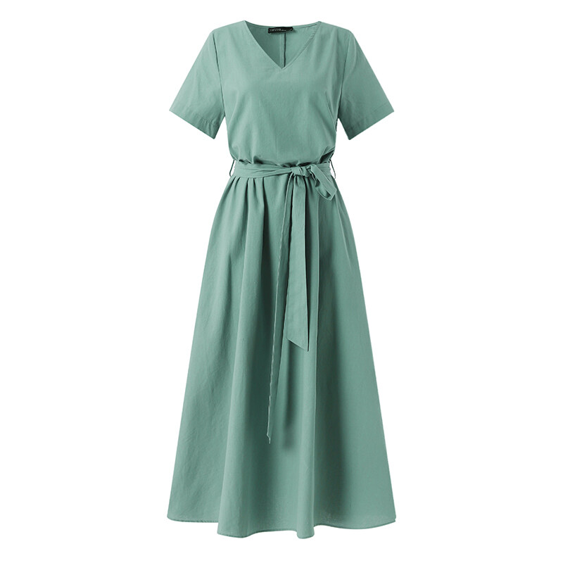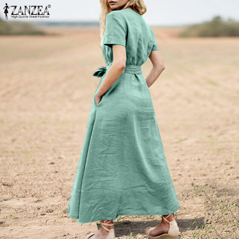 ZANZEA Women Summer Short Sleeve V Neck Belted Cotton Dress Casual Maxi Dresses