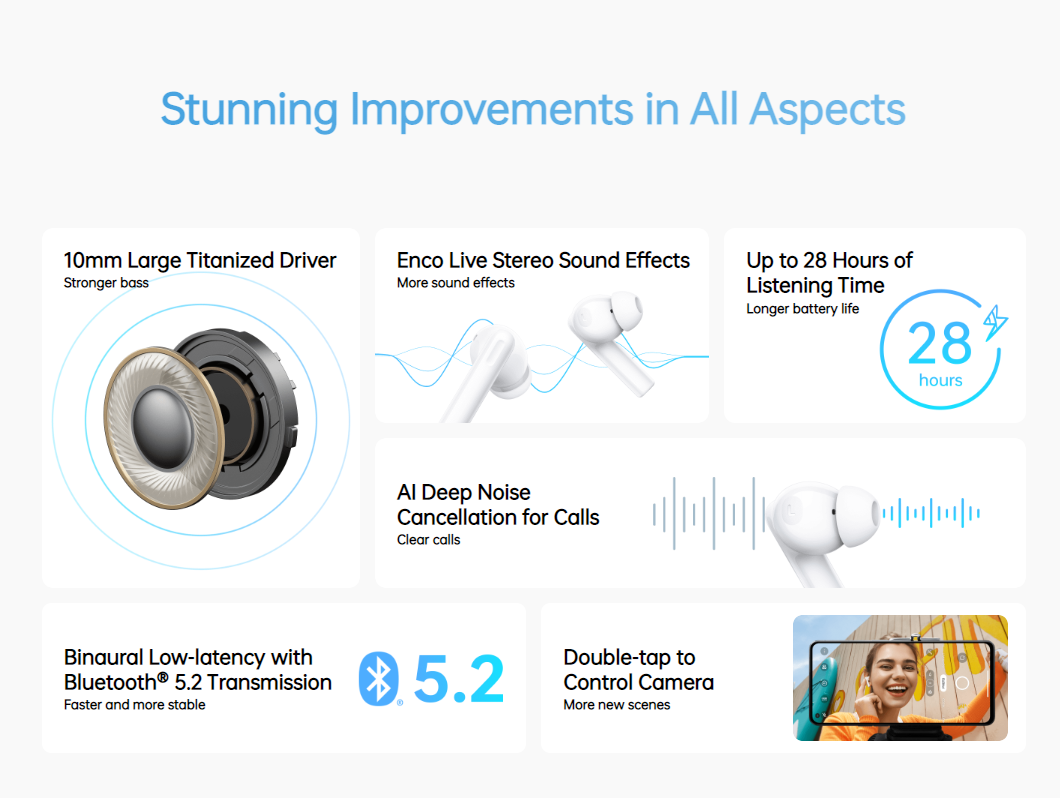 OPPO ENCO Buds2 / 10 mm Large Titanium Driver / Enco Live Stereo Sound Effect / AI Deep Noise Cancellation for Calls