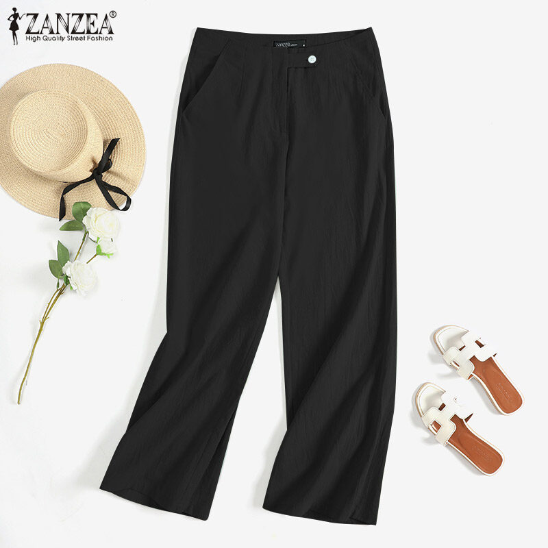 ZANZEA Women Vintage Cotton Side Pockets Trousers Casual Loose Plain Front Zipper Straight Pants #2