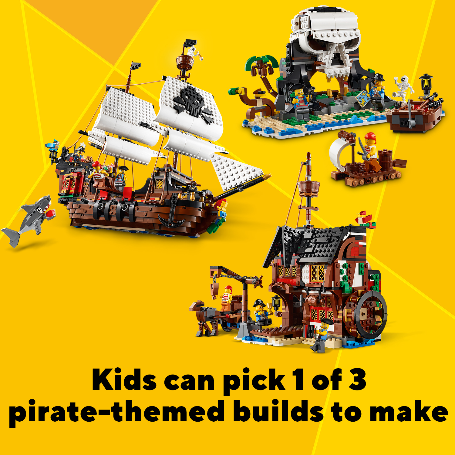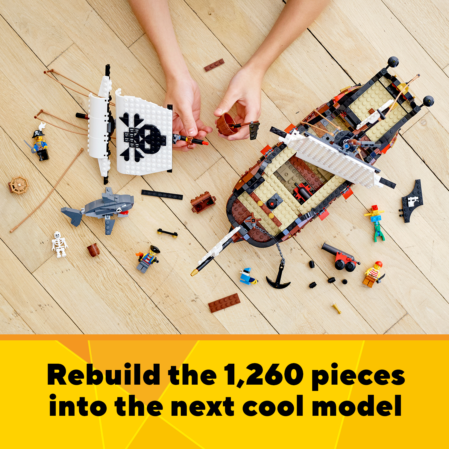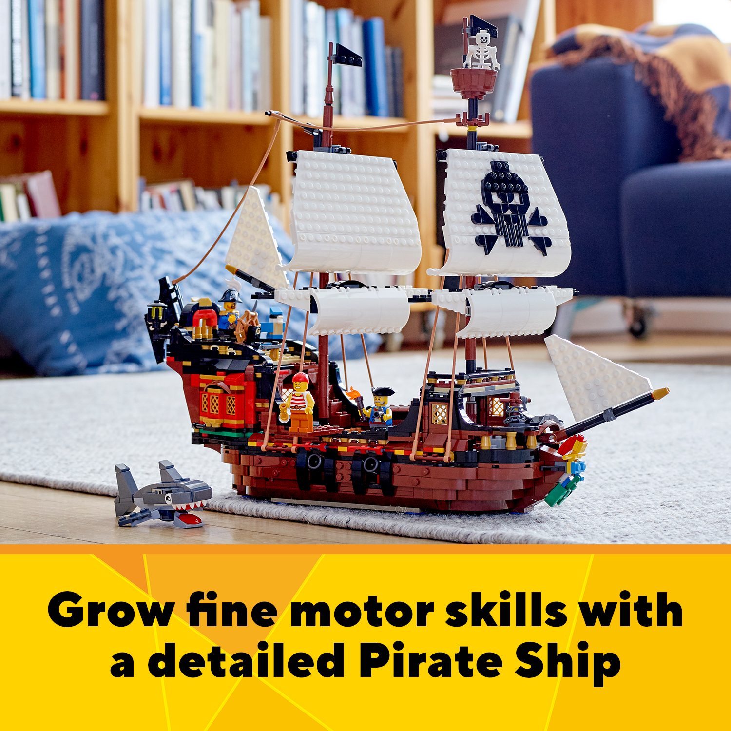 With 1,260 pieces, this LEGO® Creator 3in1 playset is perfect for kids aged 9 and up. The Pirate Ship features movable sails and anchor, plus loads of other details and accessories to spark imagination and open creative play.