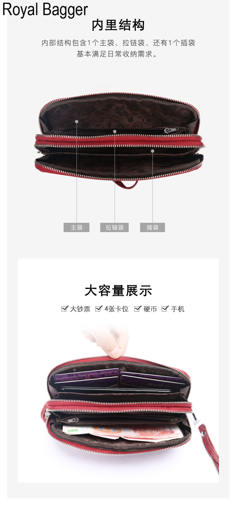 Royal Bagger Genuine Cow Leather New Fashion Double Zipper Flower Long Wallet Purse For Women Girls Super Hot High Capacity Clutch Bag Handbag Women's Multifunction Bags Casual Multi-Card Position Wal