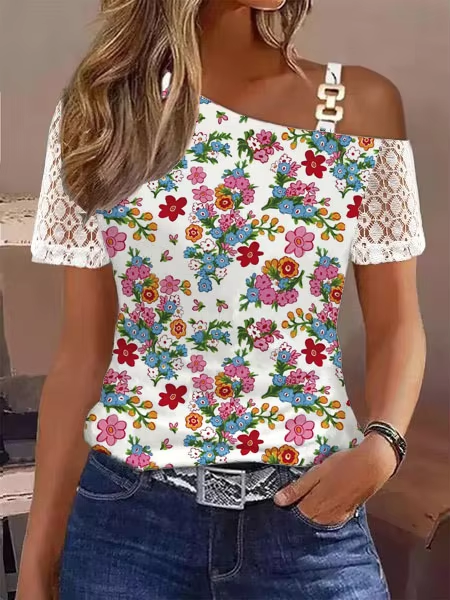 Blusas Para Mujer Women Summer Tops Fashion Sexy Lace Stitching Short Sleeve One Shoulder Buckle Loose Shirts Female Camisas