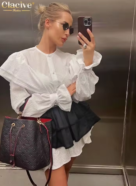 Clacive Fashion Loose White Cotton Dress Ladies Casual O-Neck Long Sleeve Mini Dress Elegant Classic Pleated Dresses For Women