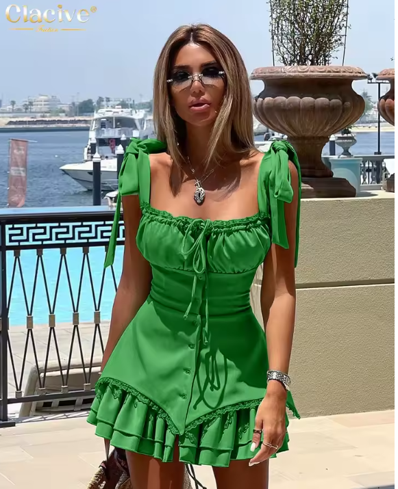 Clacive Fashion Slim Black Women's Dress 2024 Summer Strap Sleeveless Mini Dress Elegant High Waist Pleated Party Dresses Female
