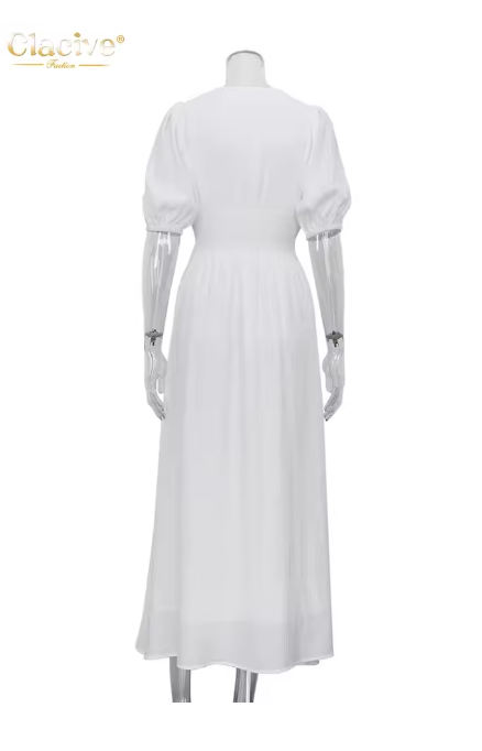 Clacive White Sexy Single-Breasted Women'S Dress 2022 Elegant Short Sleeve V-Neck Party Dresses Lady Casual Slim Midi Dress