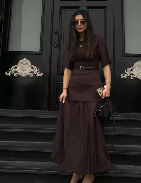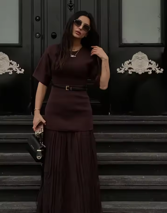 Fashion Brown Knit Pleated Patchwork Dresses Elegant Round Neck Short Sleeve Slim Fit Robe New Female Commute Outdoor Vestidos