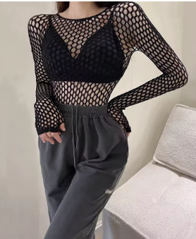 Gothic Sexy Black Fishnet Mesh See Through T-Shirt Women Skinny Goth Hollow Out Long Sleeve Shirts Crop Top Tee Shirt Streetwear