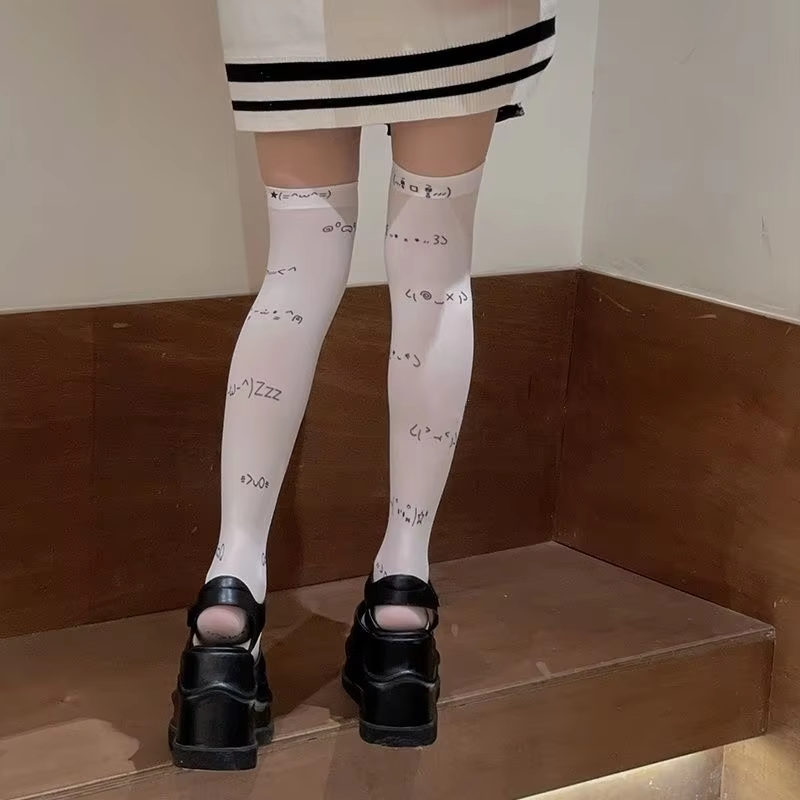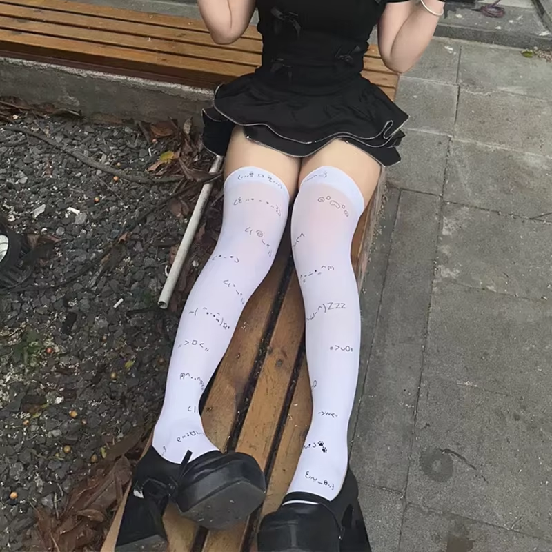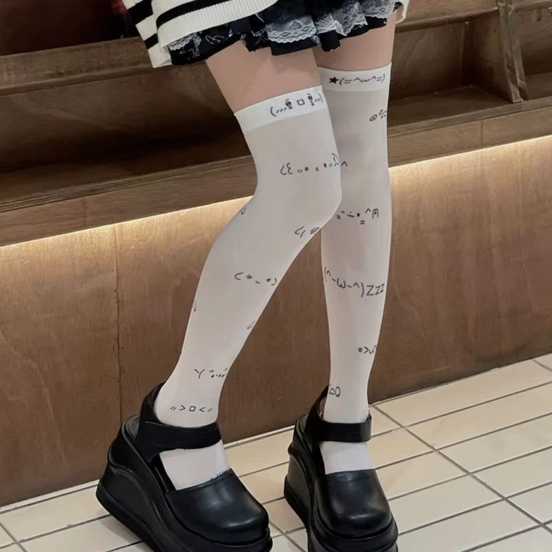 Kawaii Expression White Graffiti Letter Print Long Socks Japanese JK Harajuku Over Knee Thigh High Stockings Y2K Cosplay Socks