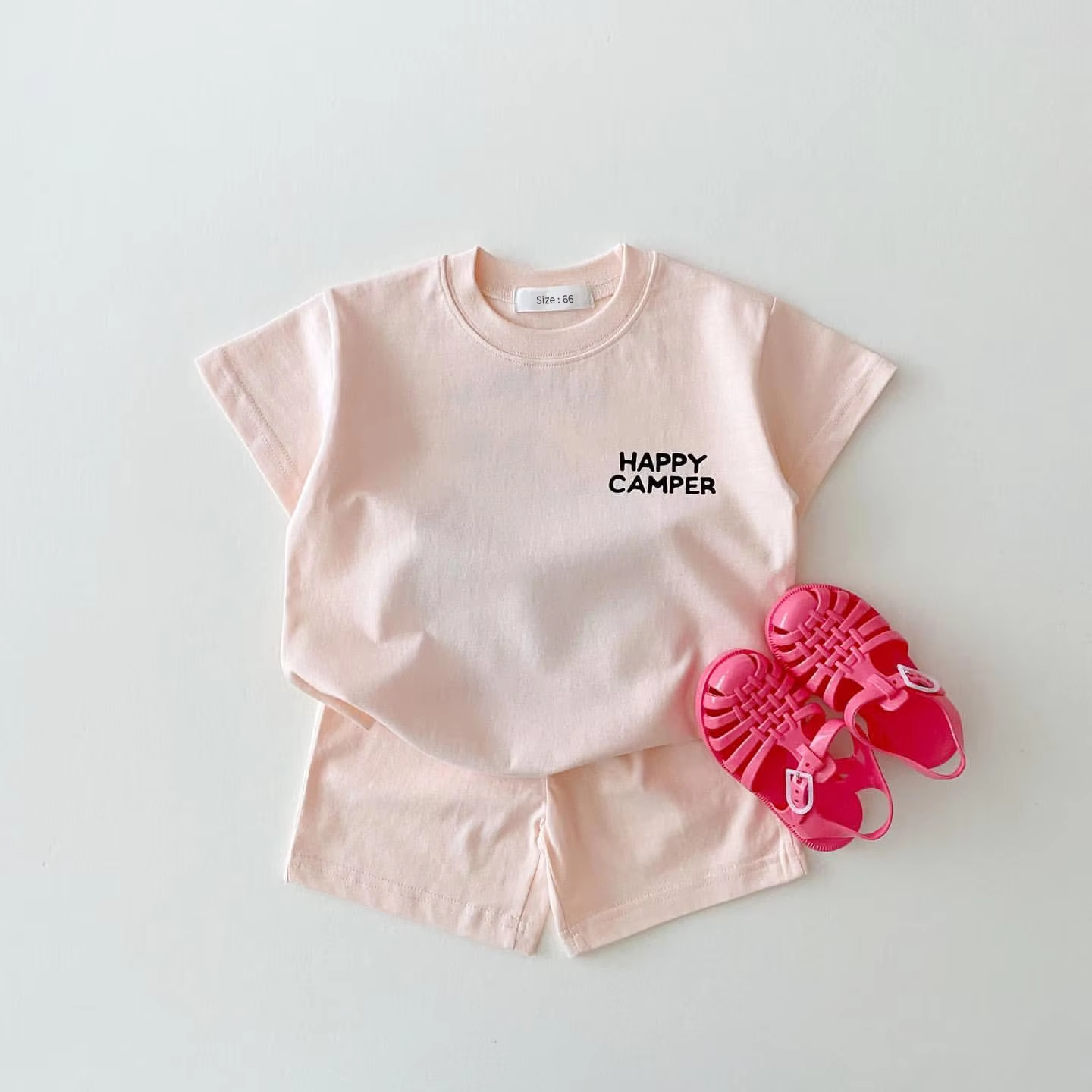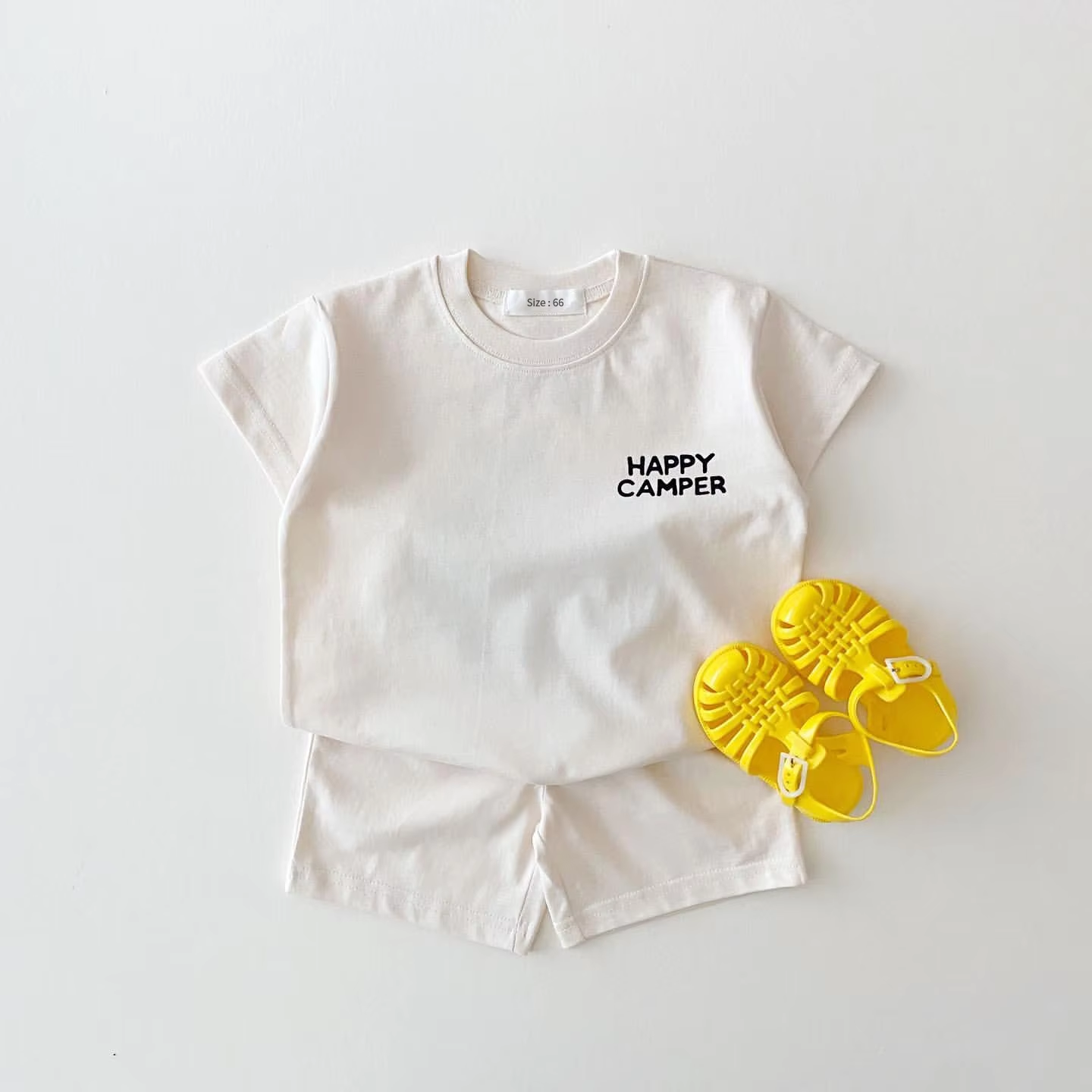 Korean Style Summer Toddler Kids Baby Boy Clothes Sets Two Sided Happy Camper Print T-shirt+Organic Cotton Shorts Girl Clothes