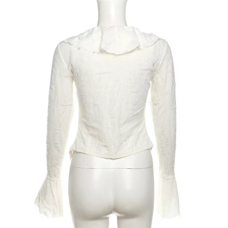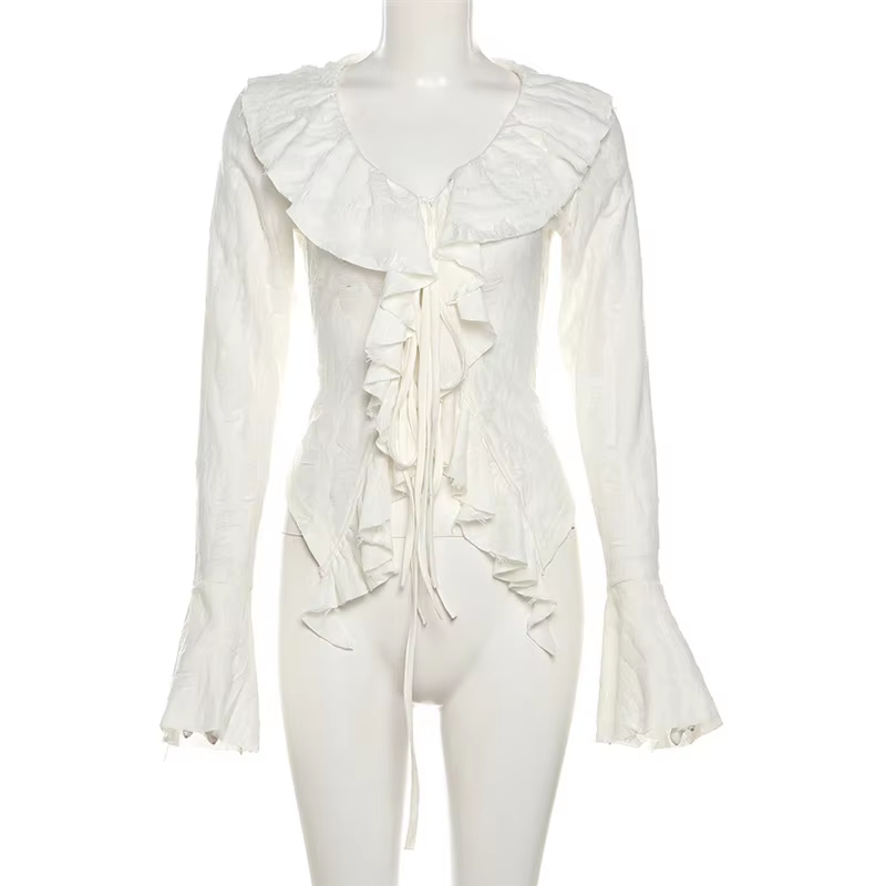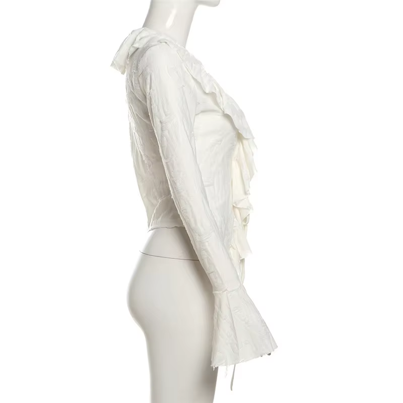 Lamuusaa Fairycore Top White Clothes Women Gothic Ruffled V Neck Flared Long Sleeve Ripped Blouse Shirt y2k Aesthetic Clothing