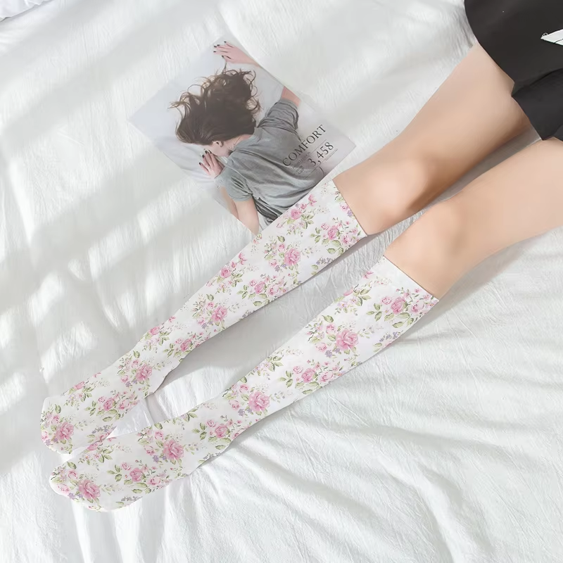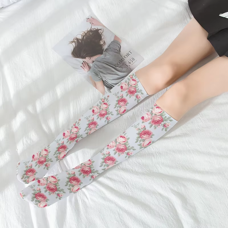 New Fashion Calf Stockings For Women 3D Printed Rose Peach Thin Velvet Knee Stockings JK Lolita Girls Sweet Sexy Mid Tube Socks