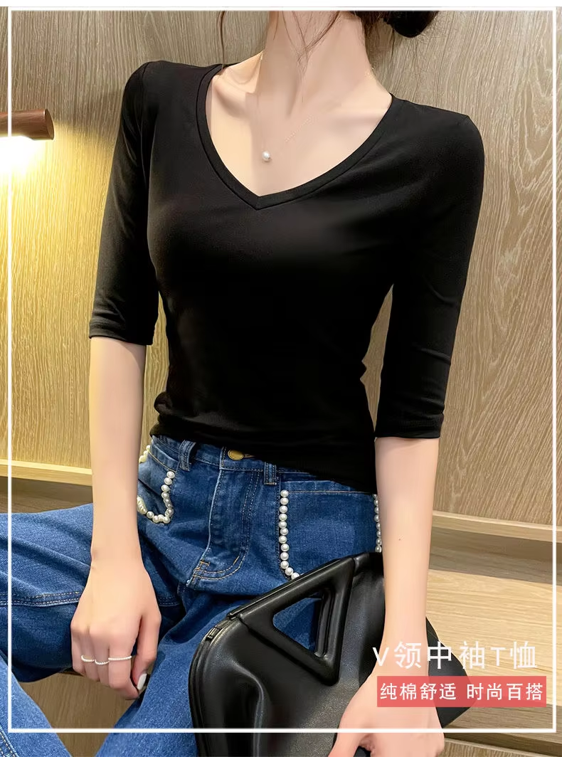 New Korean Summer Women's Solid Casual T-Shirts 2025 Half-Sleeve Tees Top Tight-fitting V-neck Tee Blouse Stretch T Shirt Women