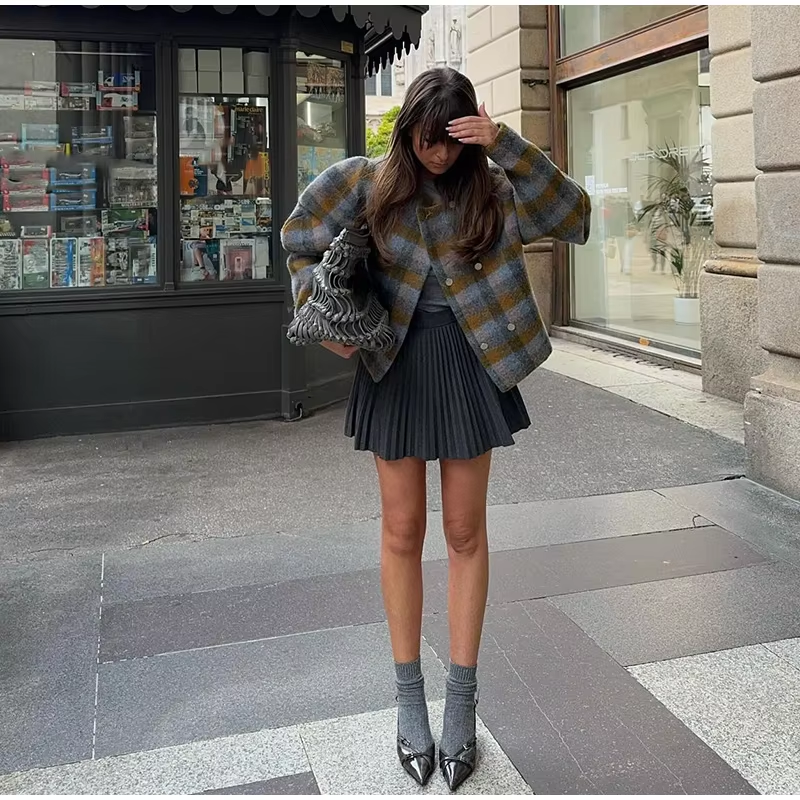 Plaid Round Neck Women Short Jacket Elegant Oversize Full Sleeves Double Breasted Coat 2024 New Fall Winter Commute Outcoat Top