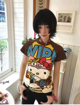 Sanrio Hello Kitty American Style Spicy Girl Tees Contrasting Color Women Summer Short Sleeved T-shirt Korean Version Trend Top