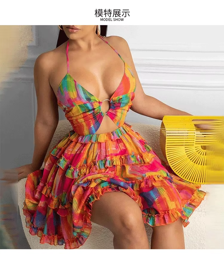 Summer New Printed Halter Neck Mini Dresses For Women Sexy Deep V-neck Hollow Out Backless Leace-up Dress Beach Vestido Feminino