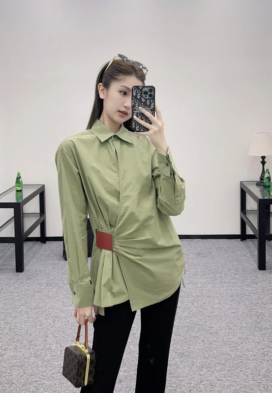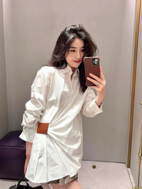 Women Shirt Spring Summer Solid Turn-down Collar Folds Lace-up Mid-length Blouse Office Lady Trendy Basics Loose Female Clothes