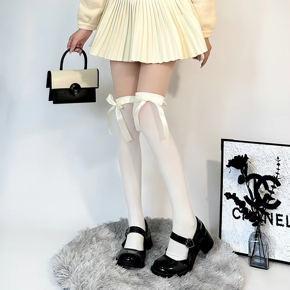 Women's Delicate Bow Velvet Thigh High Stockings Spring Summer Soft Lolita Lace-trimmed Bow Ribbon Jk Thin Over-the-knee Socks